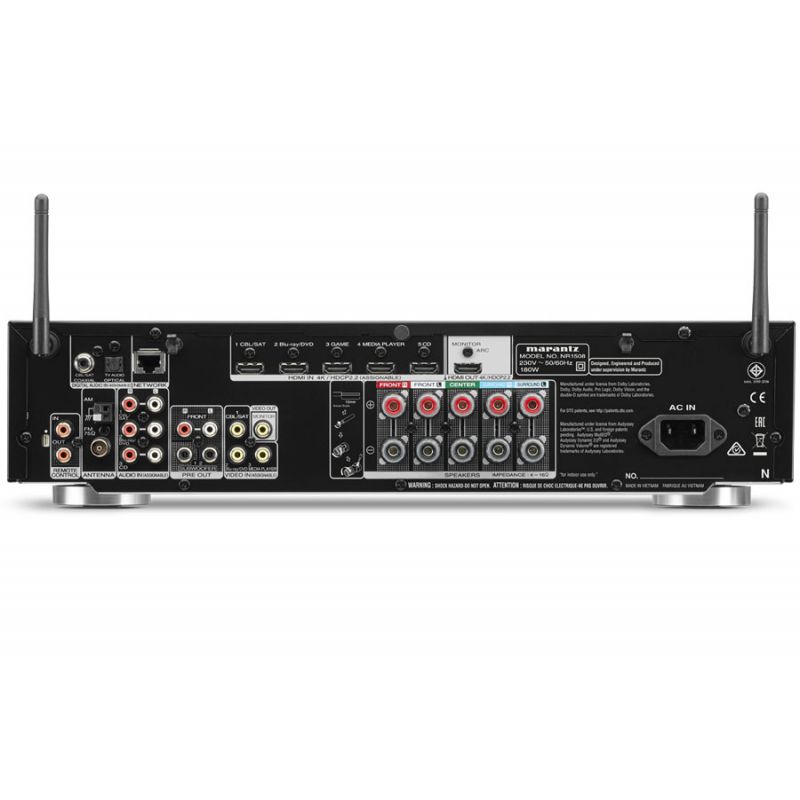 Устройство получило шесть входов HDMI (один находится на фасаде), которые поддерживают разрешение Ultra HD (60 Гц), протокол HDCP 2.2, а также стандарты HDR10 и Dolby Vision (вариант HDR с поддержкой динамических метаданных и 12-битовой глубины цвета). После обновления ПО станет доступным прием формата HLG, разработанного для HDR-телетрансляций. Доступна функция CEC для HDMI, дающая возможность управлять Marantz NR1508 с помощью пульта ТВ, оснащенного технологией Smart TV. Модель может похвастаться парой сабвуферных выходов. Помимо аналоговых AV-разъемов имеются цифровые входы (оптический и коаксиальный). Для подключения АС используются пять пар винтовых терминалов. Управлять ресивером можно не только посредством штатного ПДУ, но и с помощью фирменного приложения.
