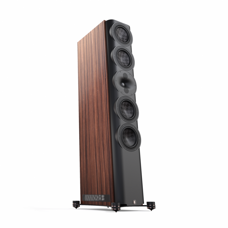 Четыре 180 миллиметровых НЧ-СЧ широкополосных динамика отрабатывают нижнюю середину и басовый регистр вплоть до 25 Гц и тоже оснащены тонкослойными углеродными диафрагмами из материала Textreme с уникальным крупным сетчатым плетением. Прочность диффузоров увеличена за счет сэндвич-конструкции с прослойкой из вспененного полимера, поэтому материал получился очень легким. Излучающие поверхности у таких драйверов обладают необходимой жесткостью и при этом совершенно «бесшумны» в плане резонансов. Колонки слегка отклонены назад, возможно, для временного согласования полос. Симметрия массива драйверов, расположение, а также конструкция и высота высокочастотного модуля позволяют слушать эти колонки с любого расстояния, даже с близкого, и под любым углом.